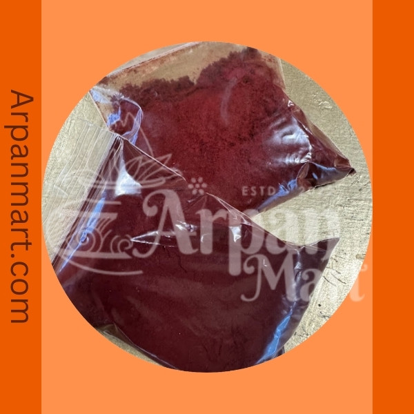 It is a deep red or orange-red powder made from turmeric (or other base ingredients) mixed with sandalwood powder, vermillion, or rose water.
